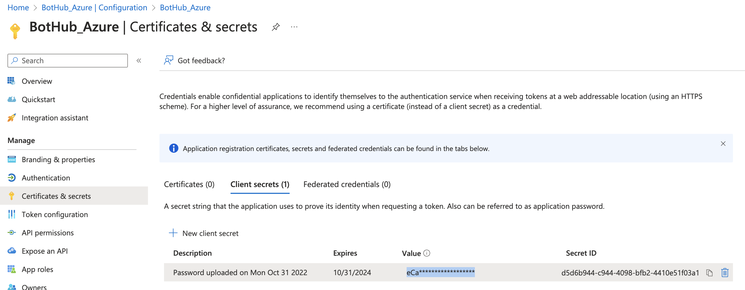 ilk ekran görüntüsündeki "Microsoft App ID" yanındaki "Manage Password" linke tıklanarak açılan 2.(Alttaki) ekran görüntüsünde yaratılan "Client secrets" kısmında yer alan ilgili Scret'ın "Value" değeri alınır.
