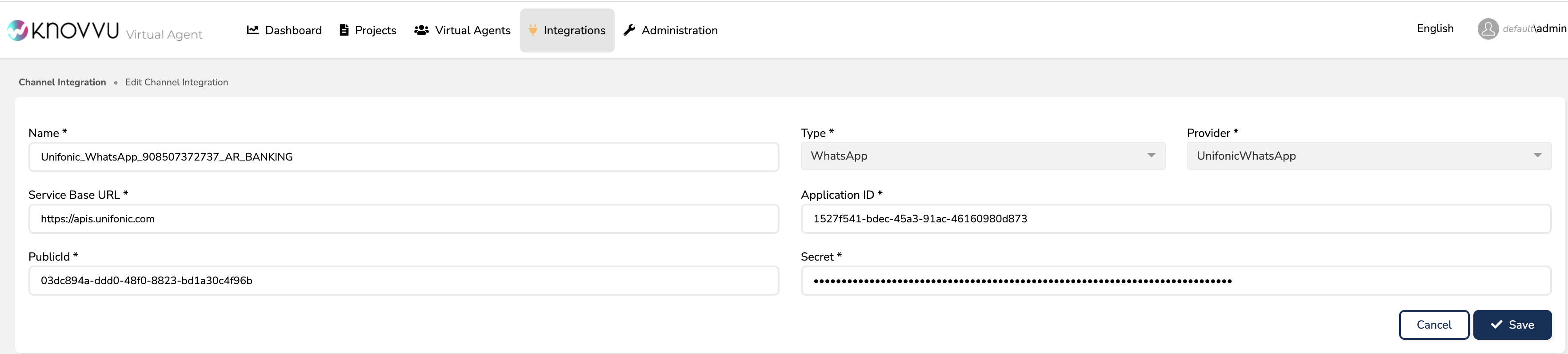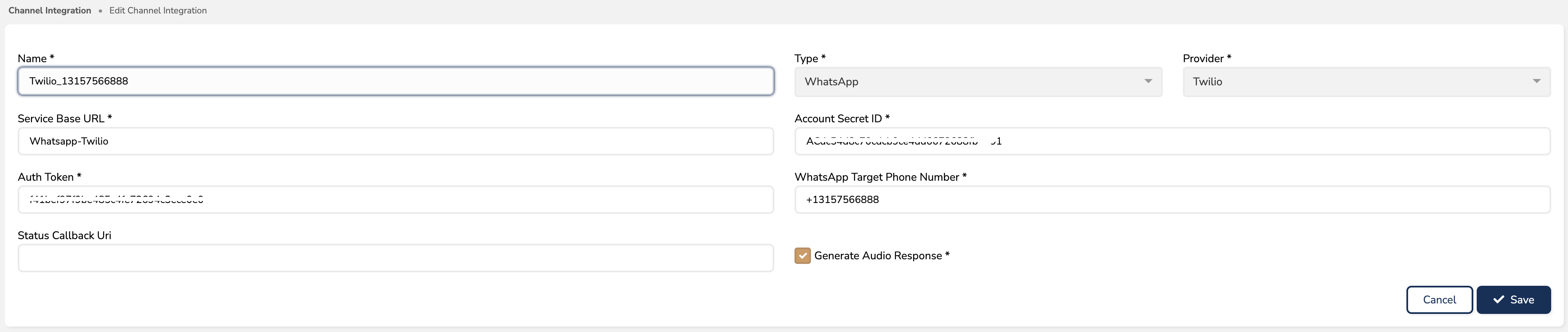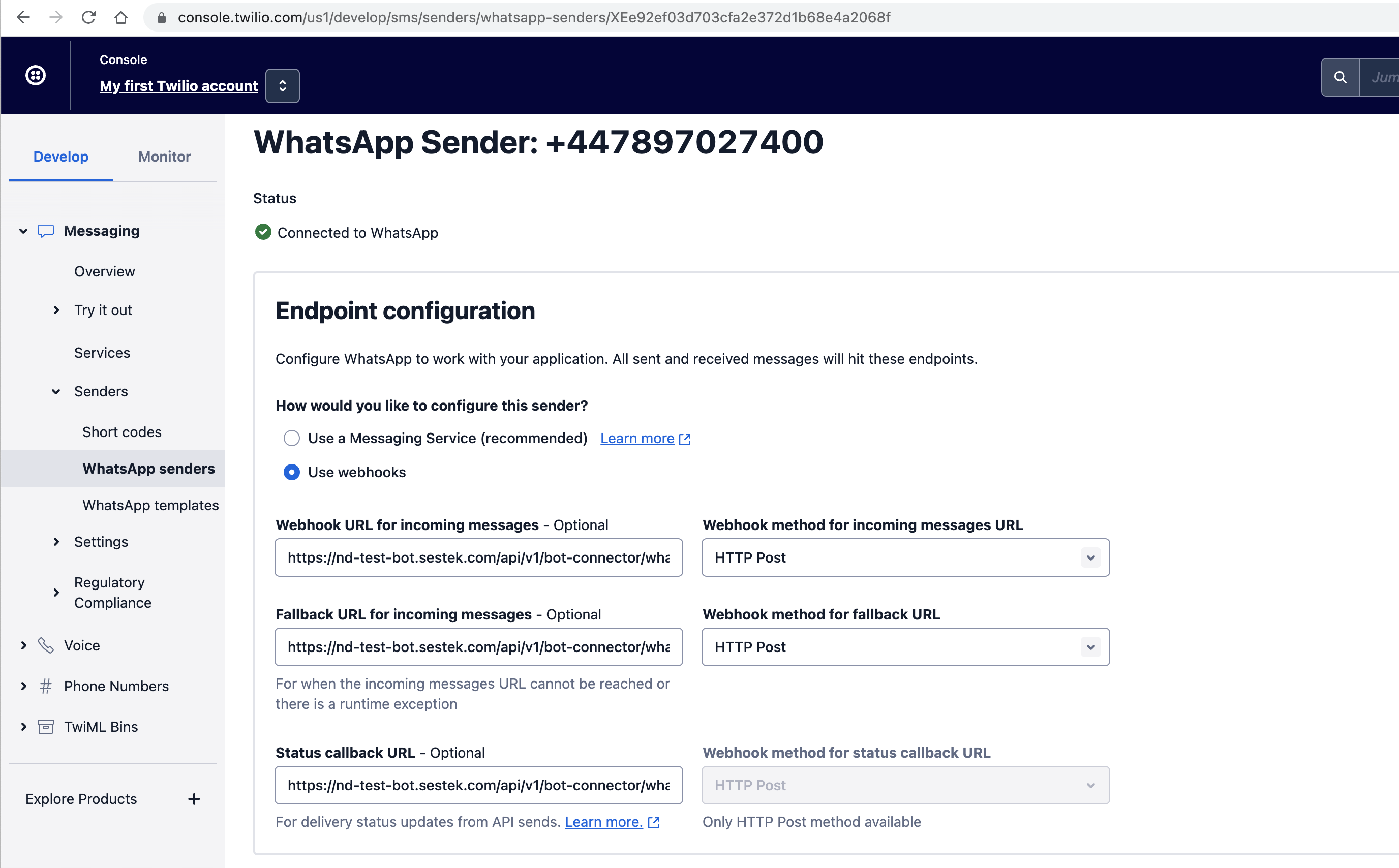 Twilio platformu altında ilgili kanal ayarları "Messaging"->"Senders"->"WhatsApp Senders" altından ilgili telefon numarası bulunur ve açılarak ayarlarda