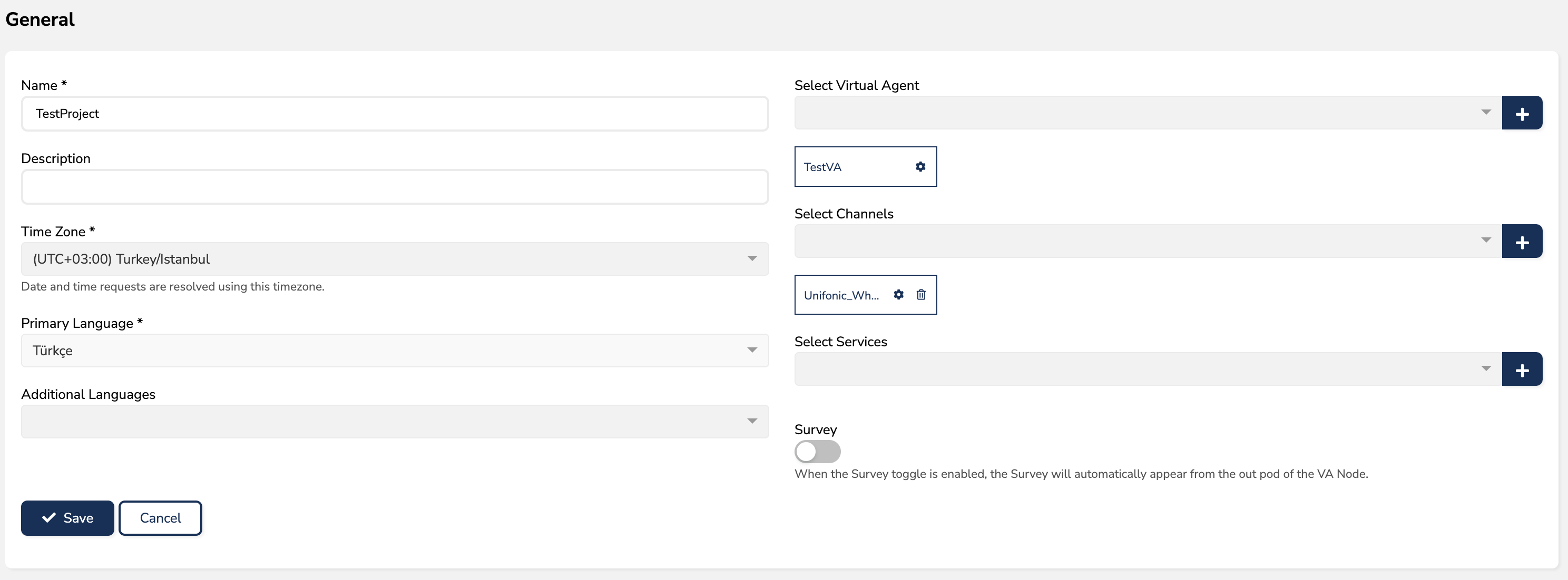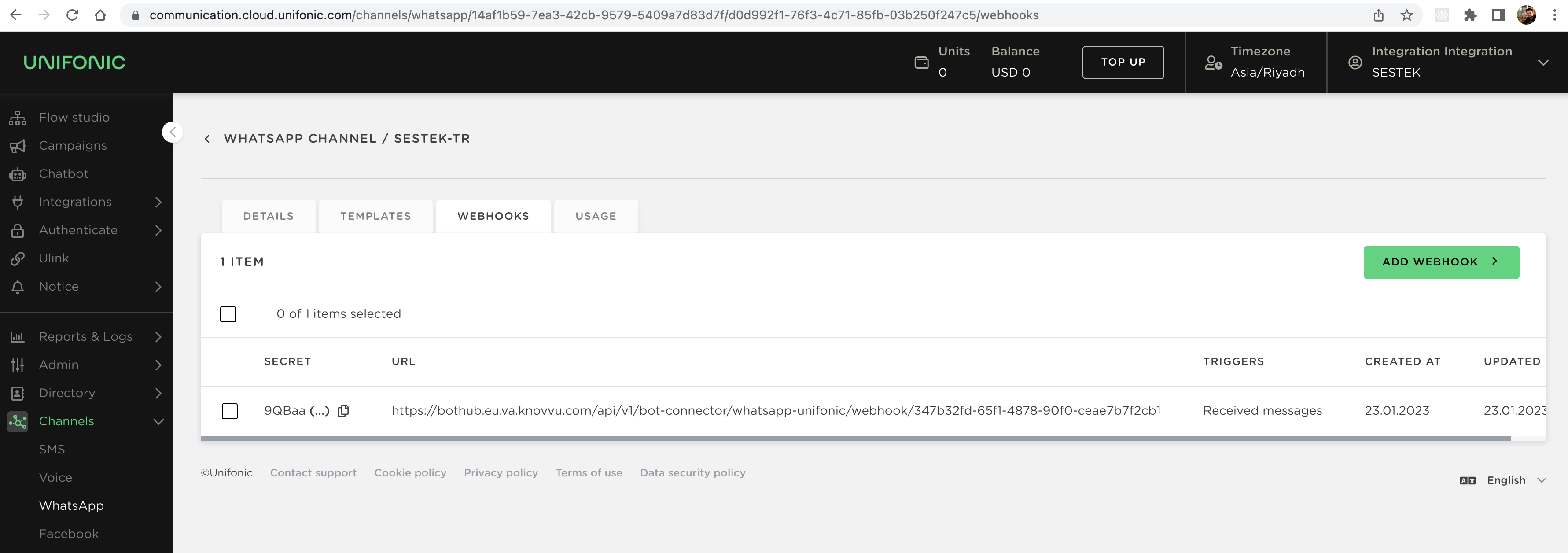 Unifonic platformu altında ilgili kanal ayarları "Channels" altından bulunur ve ayarlarda Webhook bilgisi Aşağıdaki şekilde doldurulur